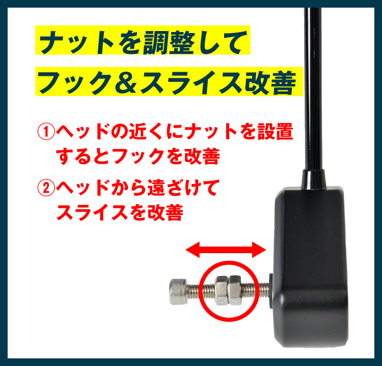 この移動ナットを移動させて、素振りをするとフックやスライスにお悩みの方も自然なフェースターンの感覚を掴めます。