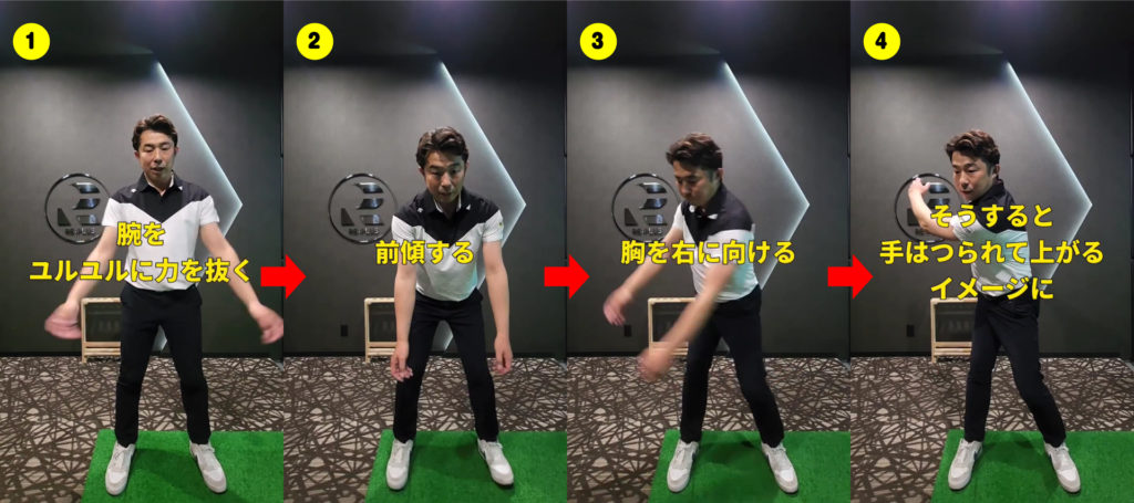 この動きによって、「腕は自分で上げるのではなく、体の動きに連動して動く」という感覚を身につけることができます。