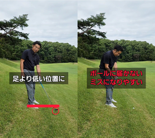 つま先下がりの状況では、ボールが自分の足元よりも低い位置にあります。このような傾斜では、普段通りのスイングではボールに届きにくく、トップや空振りなどのミスが出やすくなります。